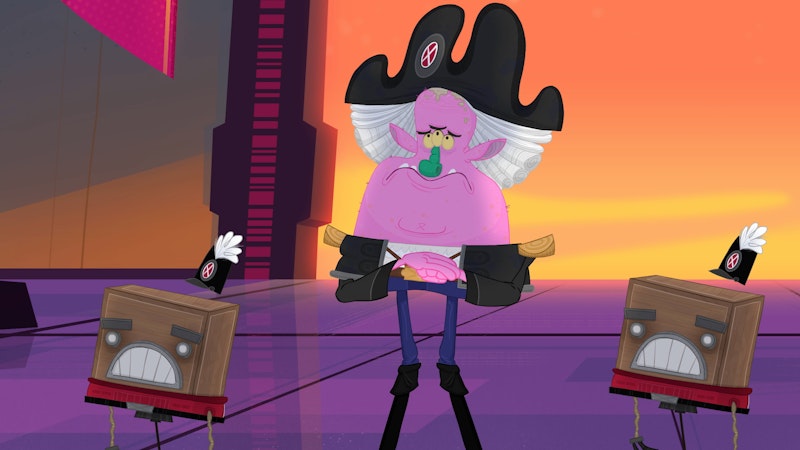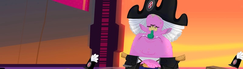 Tumeke, Wahine and Junior take their fight to the Queen, only to discover she has demoted The Pink Menace and replaced him with a much tougher, meaner new foe: The Blue Skurge.
